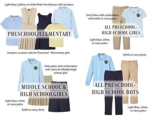 Middle & High School boys: Pants (in navy or khaki) and a polo with logo (in navy, light blue, or white)